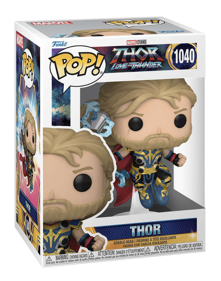 This Thor: Love and Thunder Thor Funko Pop! Vinyl Figure #1040 measures approximately 3 3/4-inches tall. Comes packaged in a window display box. Ages 3 & up,